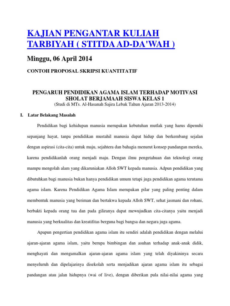 CONTOH PROPOSAL SKRIPSI PAI HUBUNGAN ANTARA TINGKAT PARTISIPASI DALAM AKTIVITAS ORGANISASI KEMAHASISWAAN DENGAN SELF EFFICACY MAHASISWA SEMESTER IV-VI DI SEKOLAH TINGGI ILMU TARBIYAH AL-QURANIYAH MANNA BENGKULU SELATAN PROPOSAL SKRIPSI Diajukan sebagai salah satu syarat penyelesayan akhir Program Serjana. Proposal judul download pendidikan agama islamContoh Proposal Skripsi Pai Pengaruh Kepribadian Guru Pai Terhadap Perilaku Siswa 11. 160 Skripsi Pendidikan Agama Islam Kuantitatif Kualitatif.